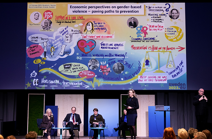 För att driva jämställdhetsarbetet inom EU framåt arrangerade Sverige också flera konferenser och möten. I början av februari hölls konferensen ”Economic perspectives on gender-based violence – paving paths to prevention”, med syftet att belysa ekonomiskt våld och kopplingen mellan kvinnors ekonomiska egenmakt och förebyggandet av mäns våld mot kvinnor. Vid konferensen deltog jämställdhetsexperter, intresseorganisationer och representanter från EU:s medlemsstater samt arbetsmarknadens parter. Några veckor senare arrangerades ett högnivåmöte för ministrar och statssekreterare på jämställdhetsområdet. Under mötets första dag diskuterade deltagarna jämställdhetsintegrering i budgetprocessen. Under mötets andra dag presenterade Sverige ett antal innovativa och prisbelönade metoder för att förebygga mäns våld mot kvinnor.