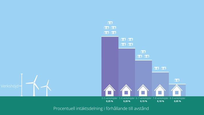 Därefter bestäms hur stor del av intäkten som respektive närboende ska ha rätt till. Det görs enligt en trappstegsmodell där ersättningen minskar med ökande avstånd mellan vindkraftverket och bostaden: