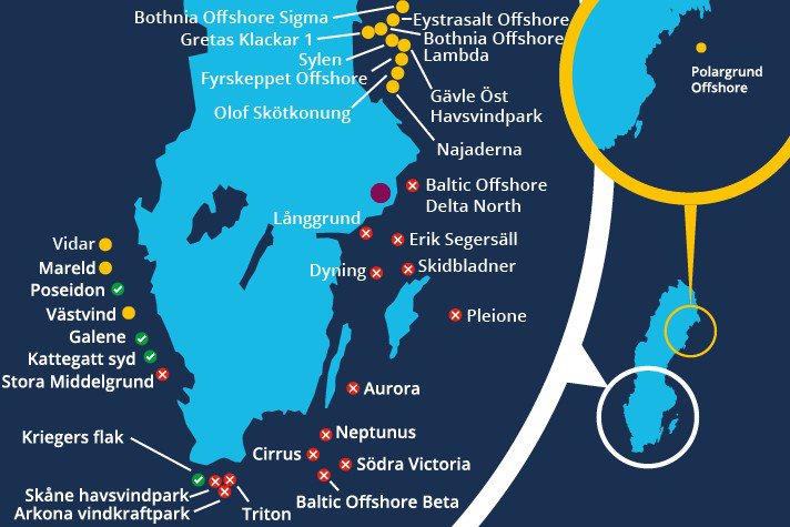 | Gretas Klackar 1 (inom territorialhavet) | 2023-03-22 till mark- och miljödomstolen. Ansökan överlämnades till regeringen 2025-04-07 | I slutskedet av beredningen i Regeringskansliet |