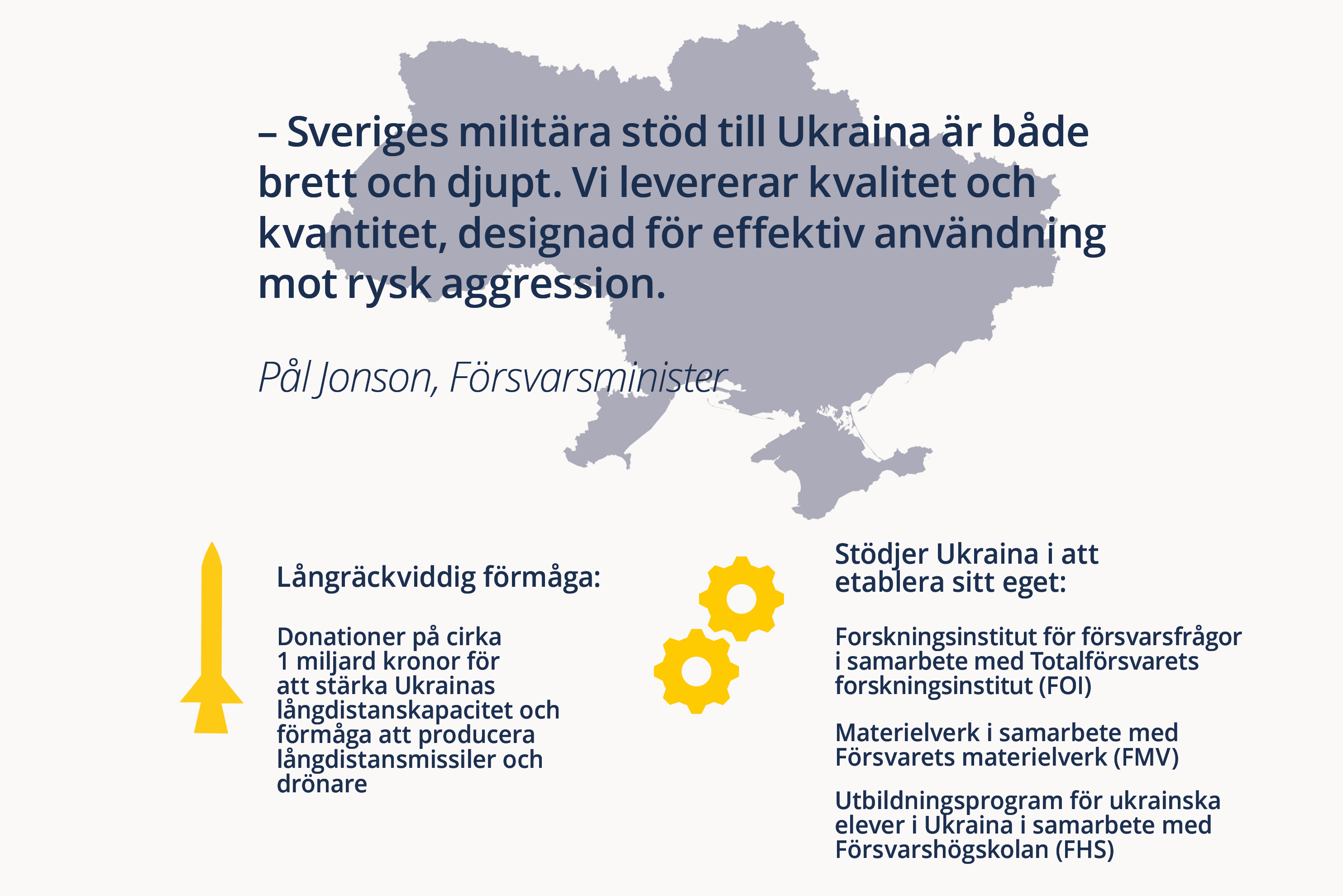 Sedan Rysslands invasion av Ukraina den 24 februari 2022 har Sverige bidragit med militärt stöd till Ukraina. Det har skett en betydande förändring av nivå och innehåll på stödet som Sverige lämnar. Från skyddsutrustning i det första beslutet till stridsvagnar, avancerade vapensystem och ammunition i senare paket. Inkluderat det stöd som presenterades av regeringen den 11 september 2025 uppgår det totala värdet av Sveriges militära stöd till Ukraina till cirka 90 miljarder kronor.