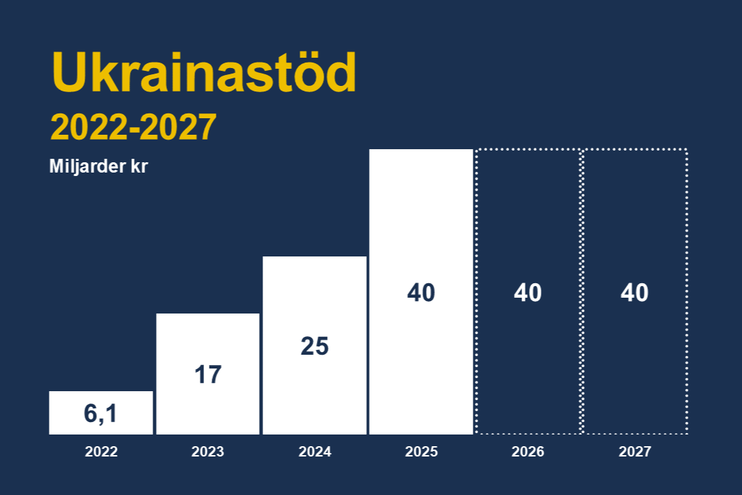 För att ytterligare stärka stödet till Ukraina och säkerställa en långsiktighet möjliggör Sverige stöd till Ukraina med 80 miljarder kronor. Regeringen skapar en tvåårig ram för det militära stödet till Ukraina som ger 40 miljarder kronor årligen 2026–2027.