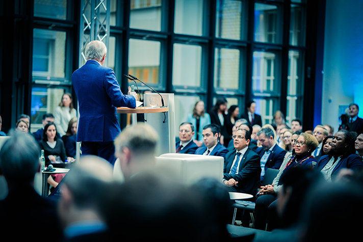De medverkande avbildade snett ovanifrån stående vid var sin talarstol