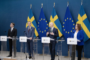 Justitieminister Gunnar Strömmer bjöd in till pressträff tillsammans med Adam Marttinen, ledamot i justitieutskottet (SD), Ingemar Kihlström kriminalvårdspolitisk talesperson (KD), och Martin Melin rättspolitisk talesperson (L). Foto: Pernilla Rutberg/Regeringskansliet
