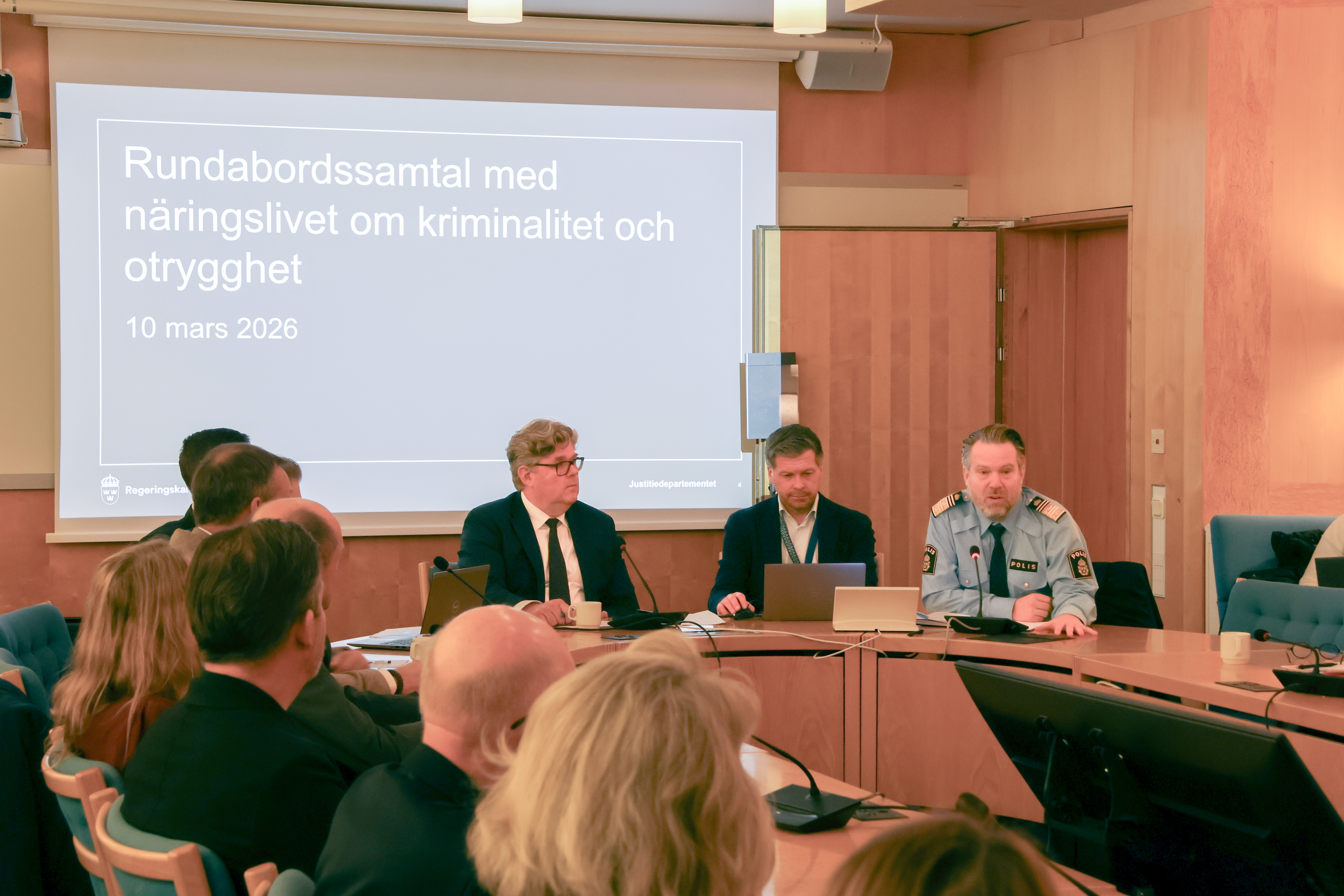 Brottsförebyggande rådet och Polismyndigheten inledde rundabordssamtalet. Därefter delade näringslivsrepresentanter med sig av sina främsta utmaningar och förslag på åtgärder. Deltagarna diskuterade också hur organisationerna själva kan bidra ytterligare i arbetet med att bekämpa och förebygga kriminalitet och stärka tryggheten.