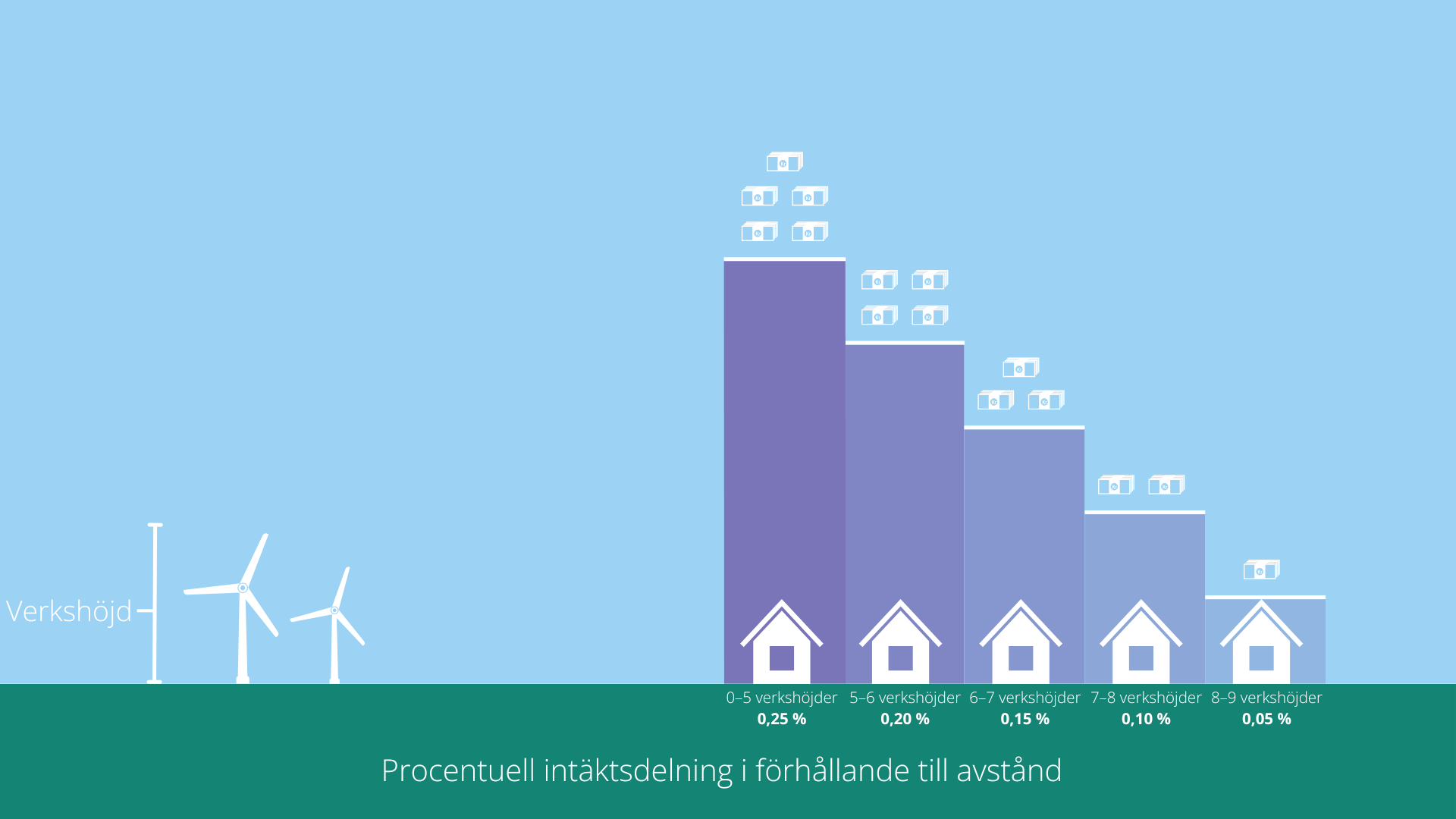 Därefter bestäms hur stor del av intäkten som respektive närboende ska ha rätt till. Det görs enligt en trappstegsmodell där ersättningen minskar med ökande avstånd mellan vindkraftverket och bostaden: